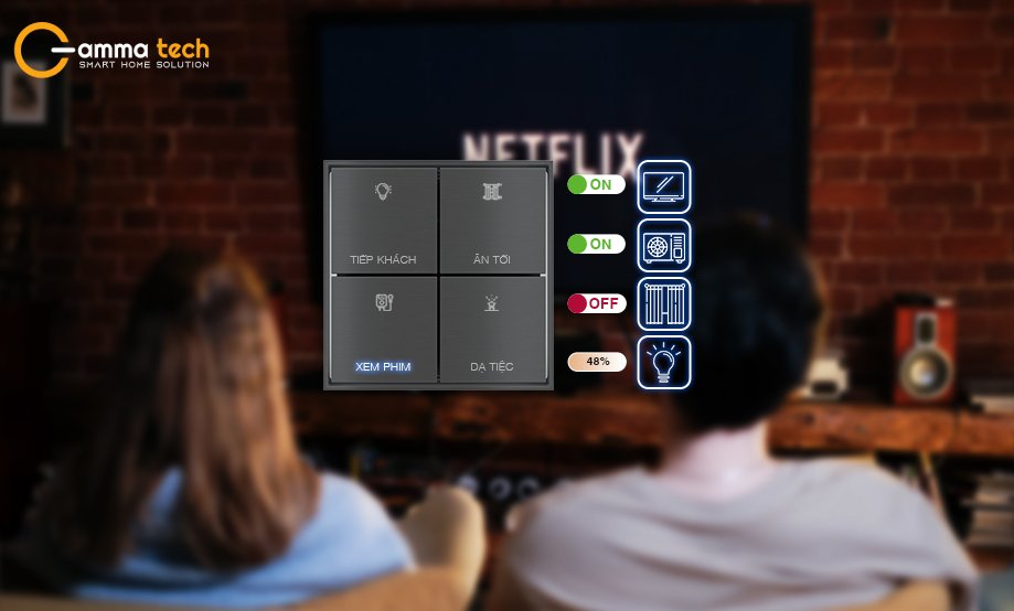 - Kịch bản xem phim: rèm cửa đóng lại - hệ thống ánh sáng tắt - đèn hắt dimmer 40% - điều hòa tự động điều chỉnh nhiệt độ - tivi chuyển Netflix - âm thanh đa vùng được kích hoạt - bộ dàn âm thanh điều chỉnh chế độ âm thanh phù hợp…